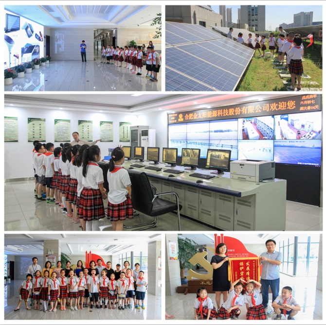 在一樓大廳,金太陽公司技術(shù)顧問黃繼業(yè)給孩子們上了一堂活潑生動(dòng)的光伏發(fā)電科普課。黃繼業(yè)通過一幅幅圖片,淺顯易懂、妙趣橫生的解說,將太陽、陽光、電能等抽象的概念形象化,將這些小學(xué)生帶入科技的海洋。小家伙們聽得津津有味,不時(shí)參與安全用電小問答,氣氛十分活躍。在集控中心,孩子們觀看了公司光伏電站的實(shí)時(shí)畫面,看到大型地面電站宏偉壯觀的電池陣列,他們不約而同地發(fā)出驚嘆和由衷贊嘆。在公司樓頂,孩子們和家長(zhǎng)實(shí)地參觀了電站,認(rèn)識(shí)了主要光伏設(shè)備。