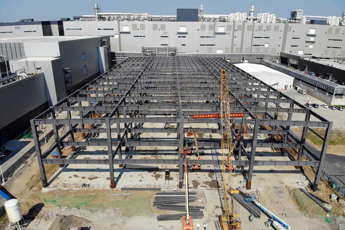 9月9日上午9時(shí),隨著最后一根主鋼梁吊裝完畢,康寧玻璃基板設(shè)施建設(shè)項(xiàng)目二期主體鋼結(jié)構(gòu)工程正式封頂,標(biāo)志著該項(xiàng)目即將全面進(jìn)入主體圍護(hù)結(jié)構(gòu)、機(jī)電安裝和裝飾裝修施工階段。